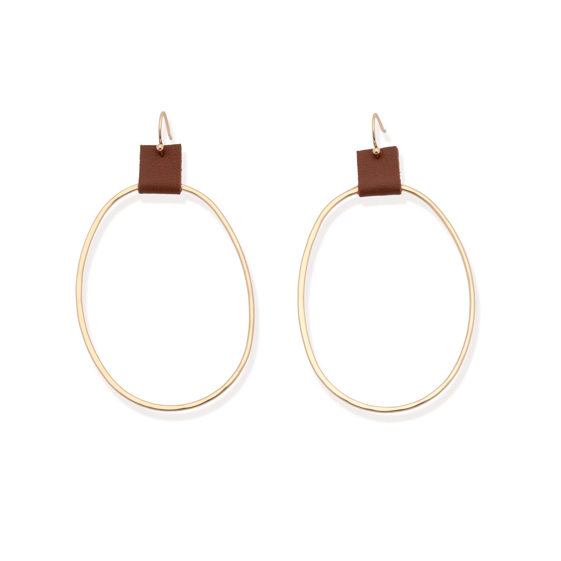 Gold or silver oval hoop with distressed brown leather, 1.5"