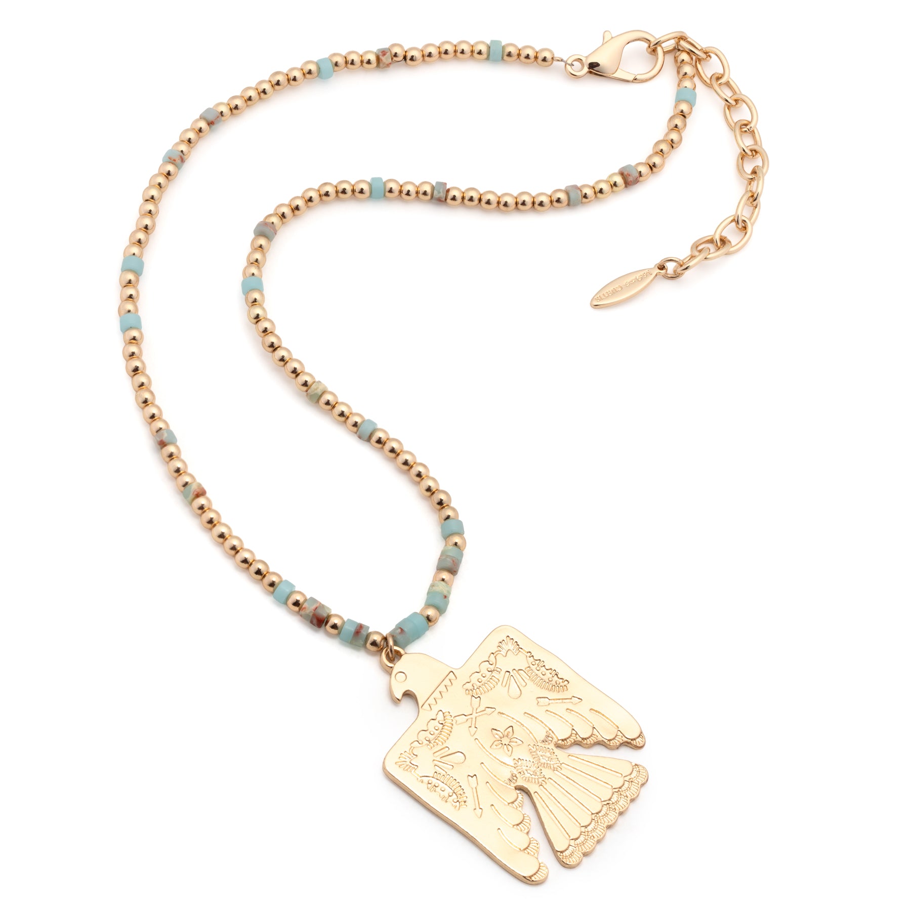 Thunderbird/eagle pendant with stone and gold or silver beaded necklace, 18" with 2" extender