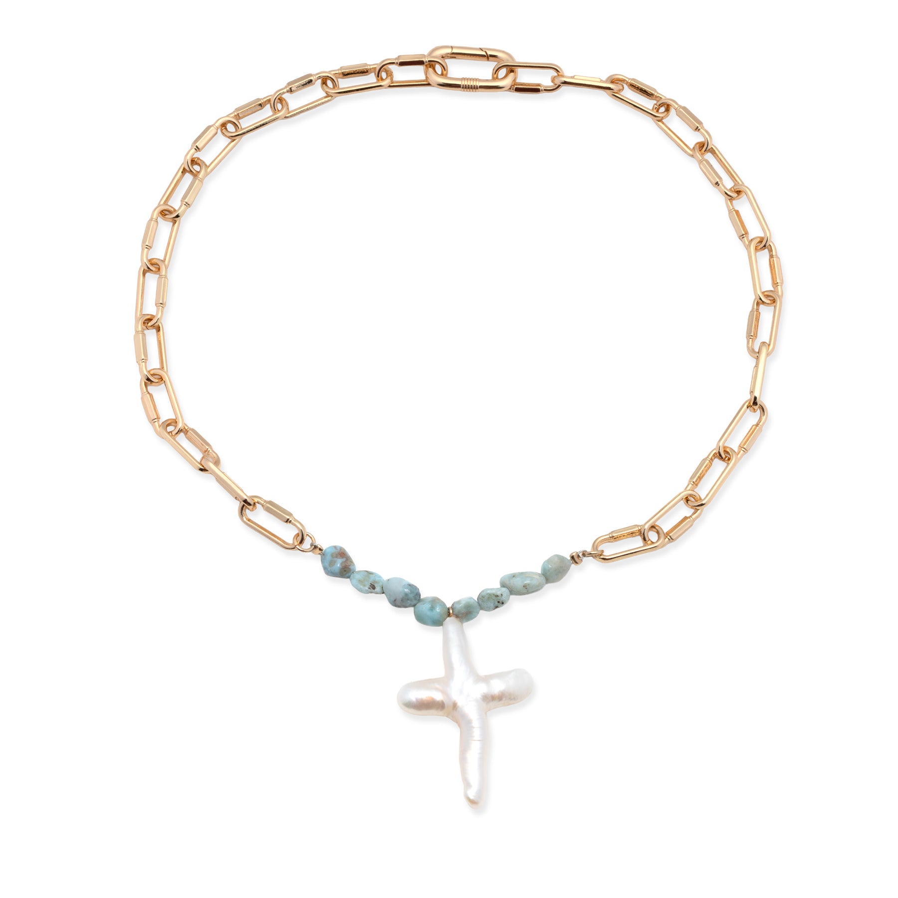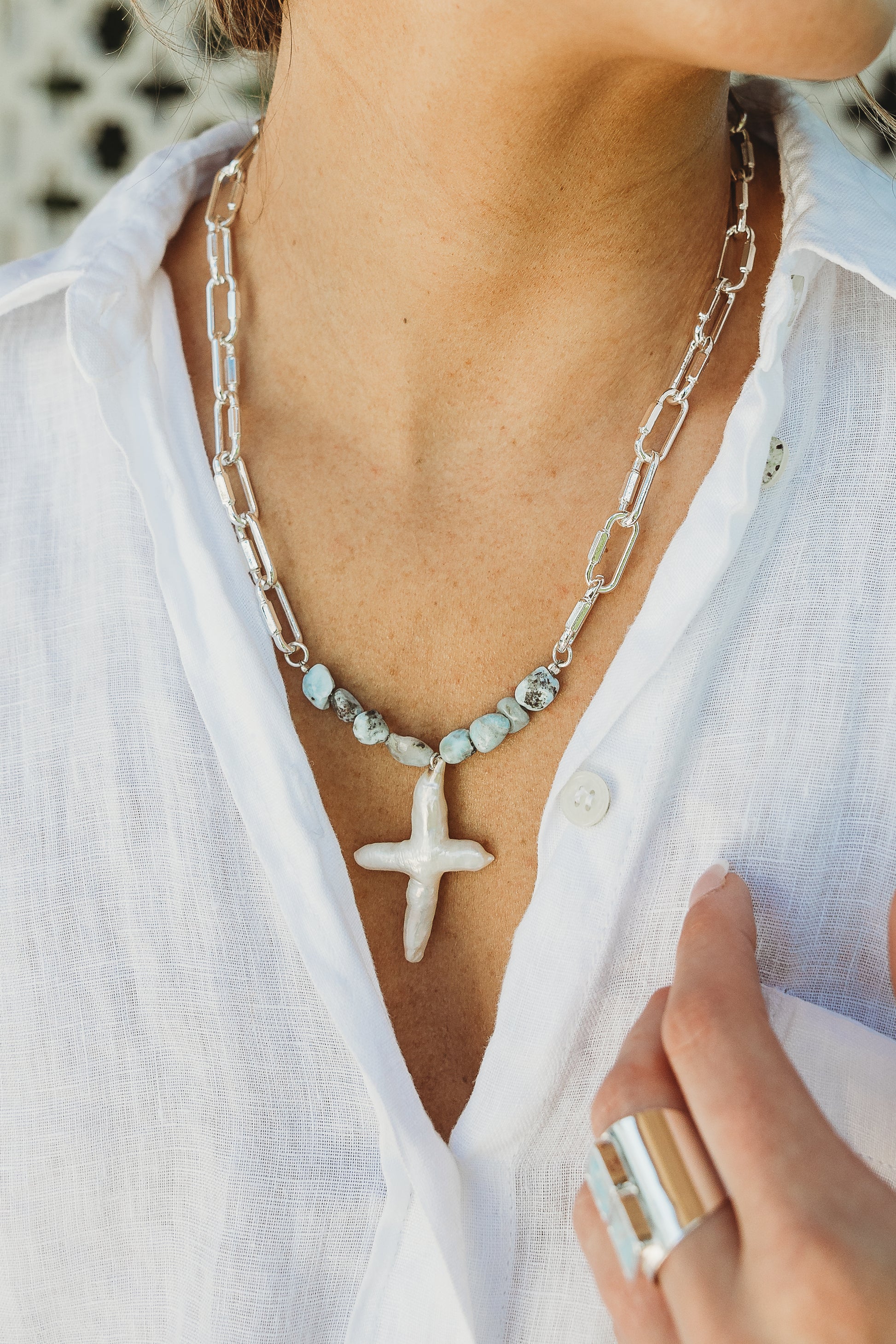 Pearl cross pendant with gold or silver paperclip chain and larimar beads, 18"