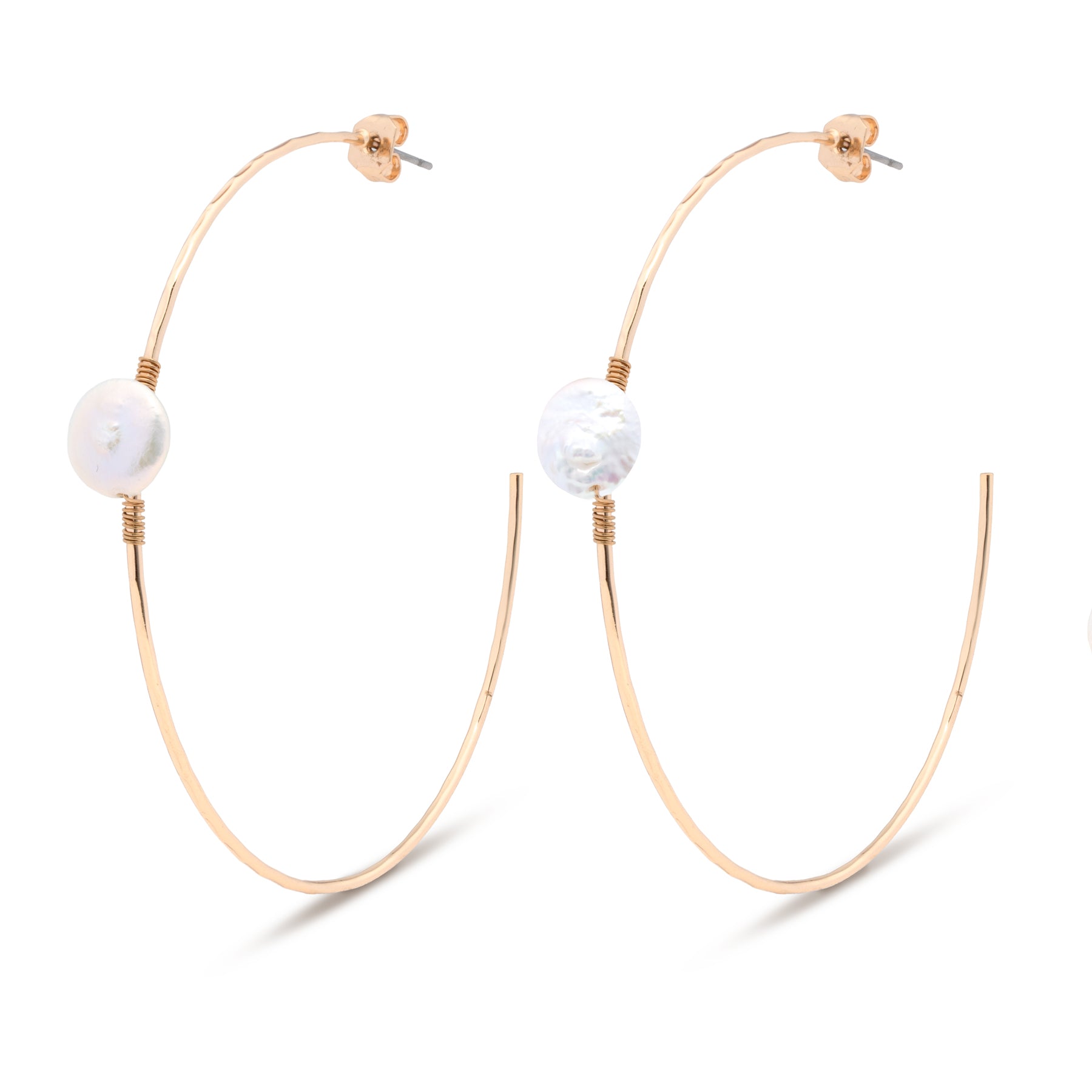 Gold or silver hammered oversized hoop with small coin pearl, 2.5" hoop
