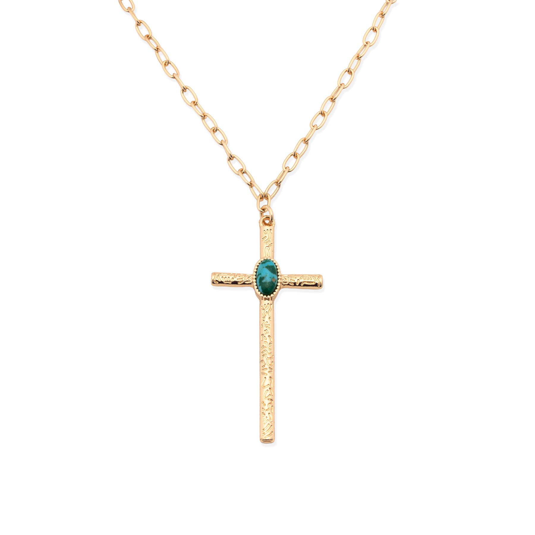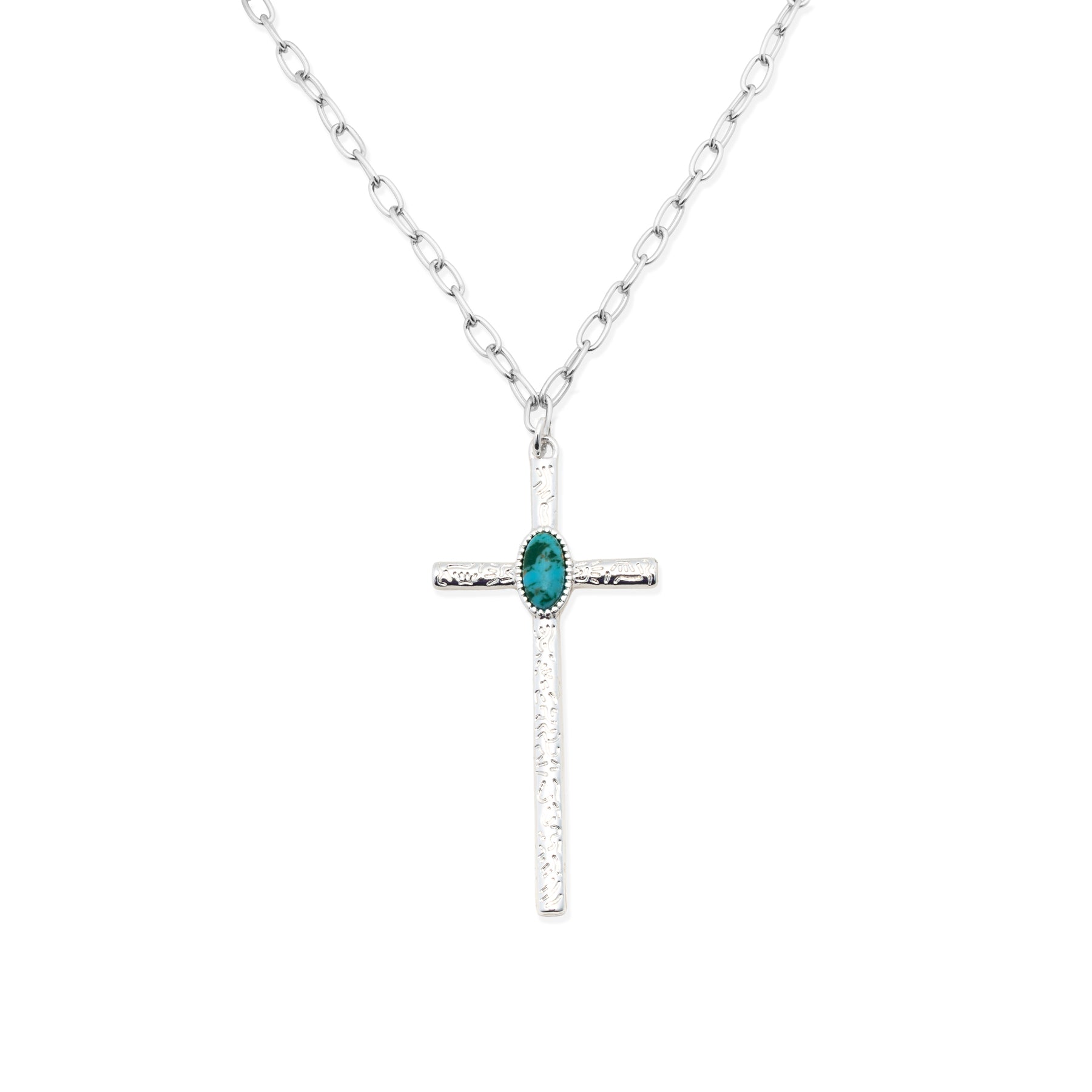 Gold or silver cross with oval blue stone on paperclip chain, 15" with 2" extender