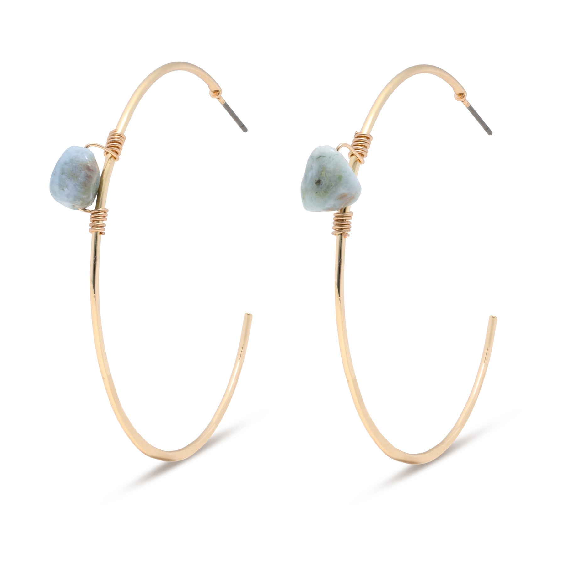 Gold or silver hammered hoop with small larimar stone, 2"