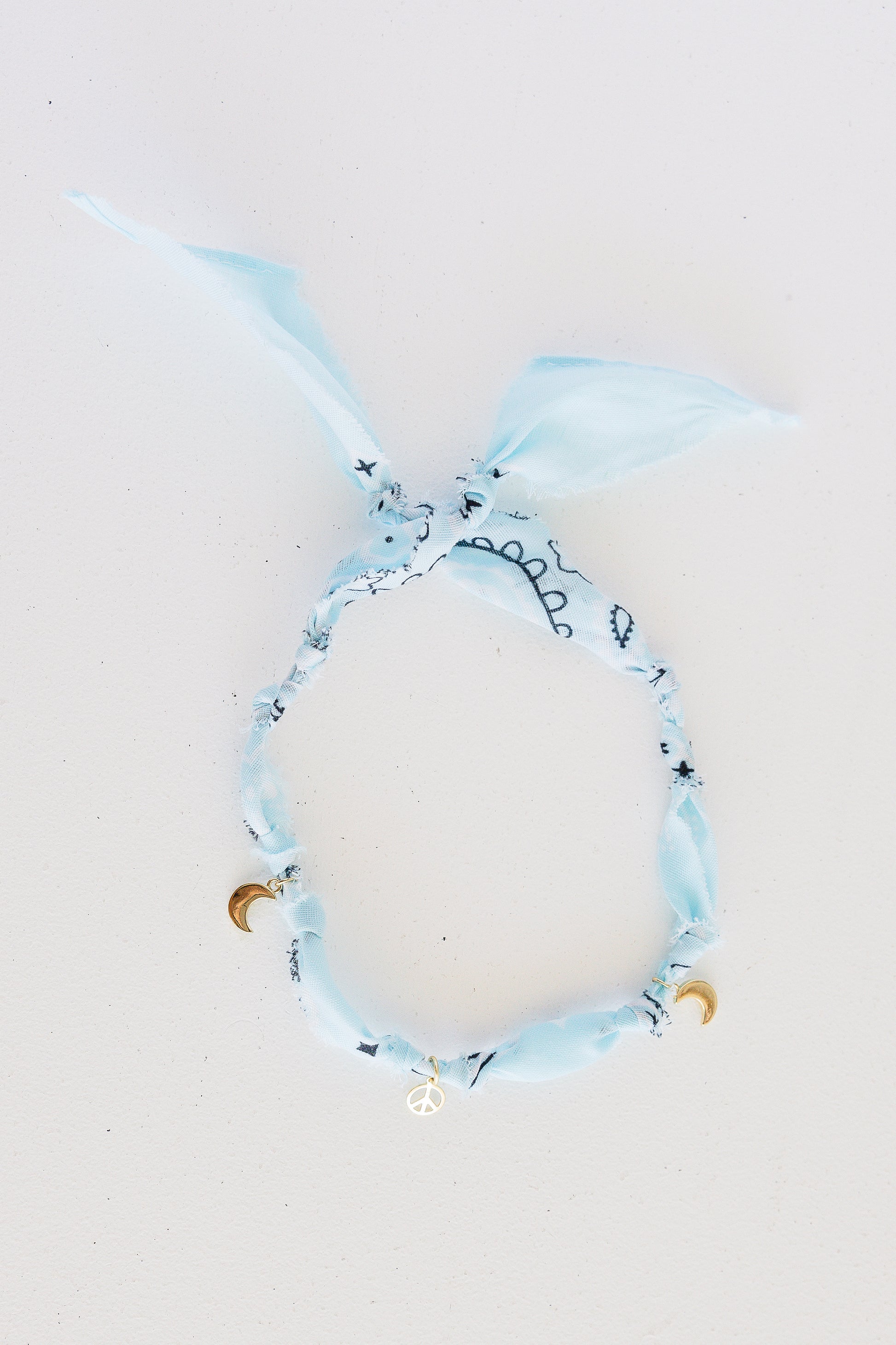 | Aqua bandana necklace with gold peace sign charm |